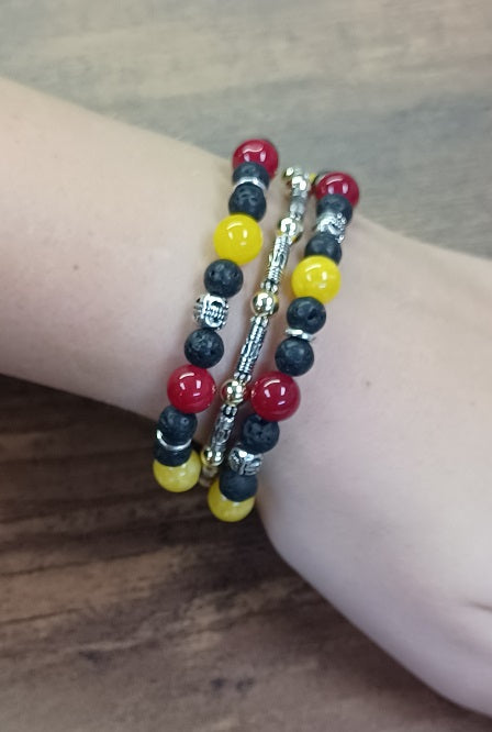 Introducing this lovely Chiefs Pewter and Lava Beaded Bracelet from Paco Designs. This locally crafted piece from Lenexa, Kansas combines the unique textures of pewter and lava beads, creating a stylish accessory. Red and yellow smooth beads stand out against these textured beads giving it an understated KC Chiefs feel. As part of our beaded bracelet collection, this item showcases our commitment to high-quality materials and intricate design. This bracelet is a versatile addition to any jewelry collection. 7.5 inches to fit most women's wrist.