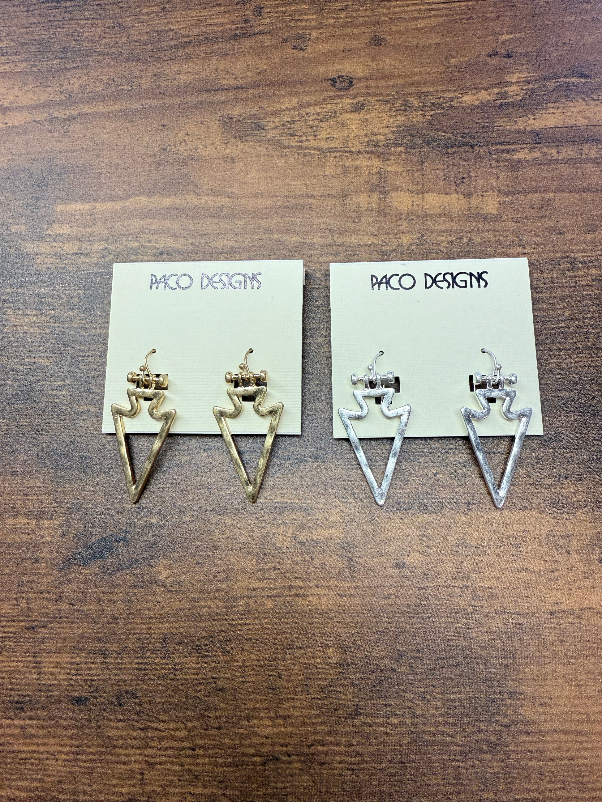 Edgy Sleek Matte Silver or Gold Arrowhead Earrings are some of our newest arrowhead earrings. These fun new earrings are available in both silver or gold- sold individually not as a set. Earrings are on fish hook wires and are lead compliant.