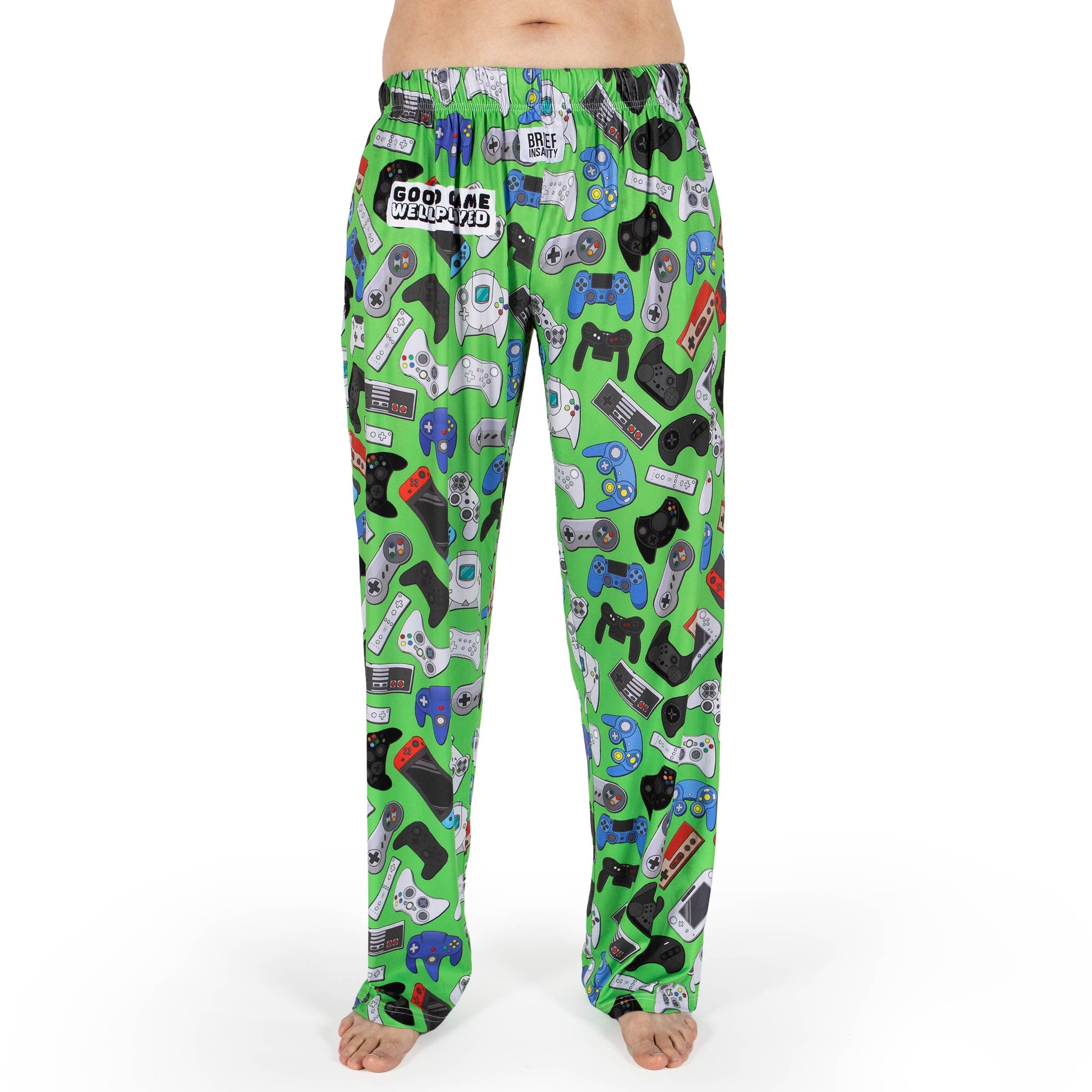 BRIEF INSANITY's newest Good Game Well Played pajama lounge pants for 2024. Welcome to the ultimate player's paradise in these bright green lounge pants! Decked out in a colorful array of gaming controllers—Xbox, PlayStation, Wii, Nintendo Switch—they're a tribute to gaming diversity. And topping it off, the triumphant declaration "Good Game Well Played" on the upper right leg makes these pants a victory lap for gamers who appreciate a stellar match and pixel-perfect comfort!