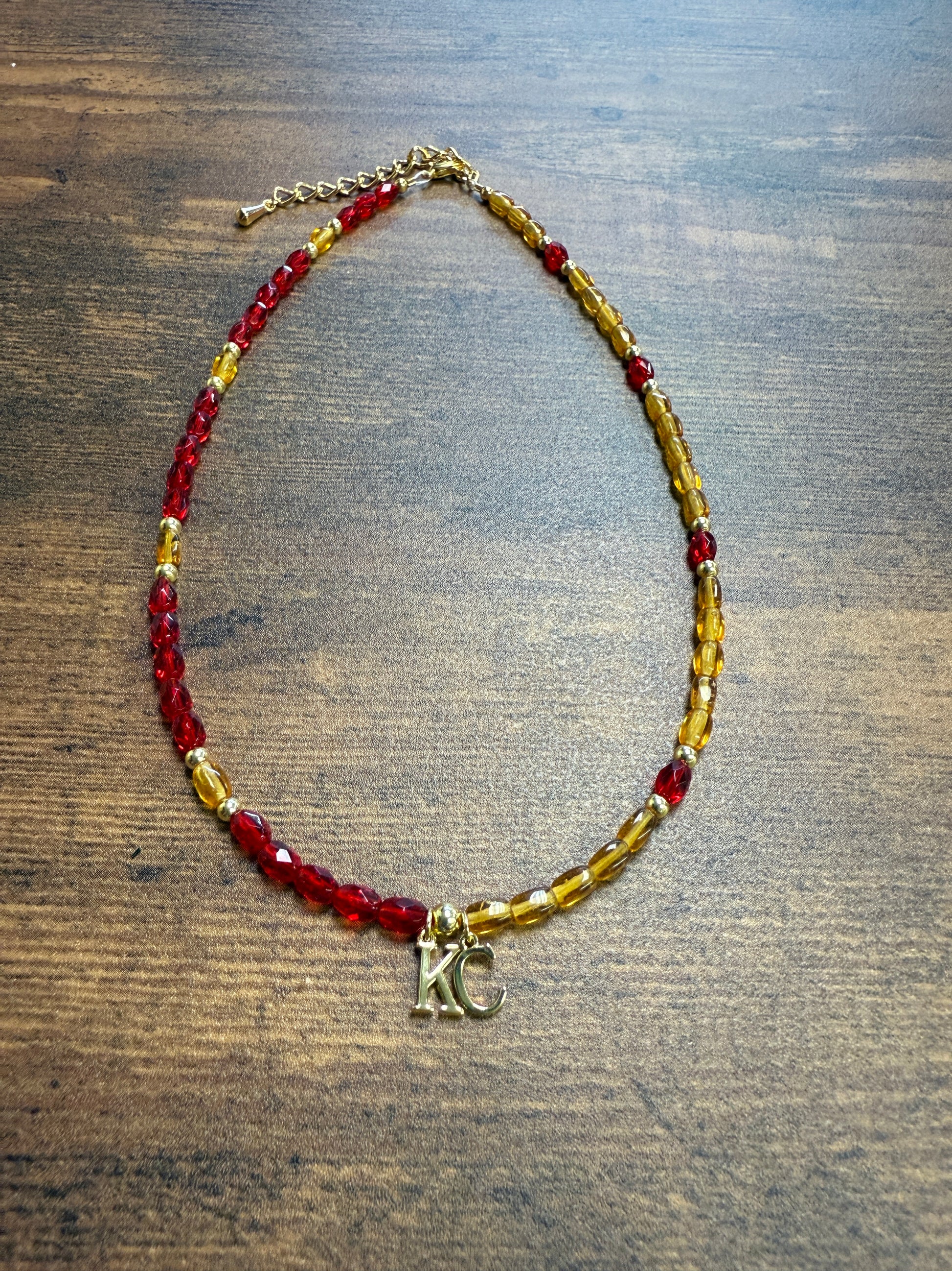 Beautiful handcrafted red and yellow beaded KC Necklace 😍 Dainty little gold KC letters and faceted glass beads come together beautifully in the fun new unique necklace! Freshen up your Chiefs accessories with this little gem!