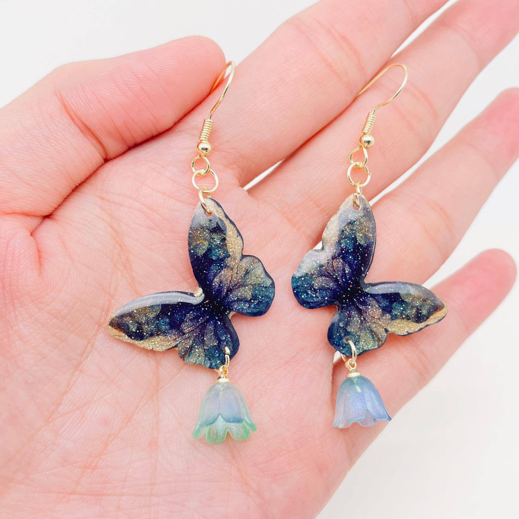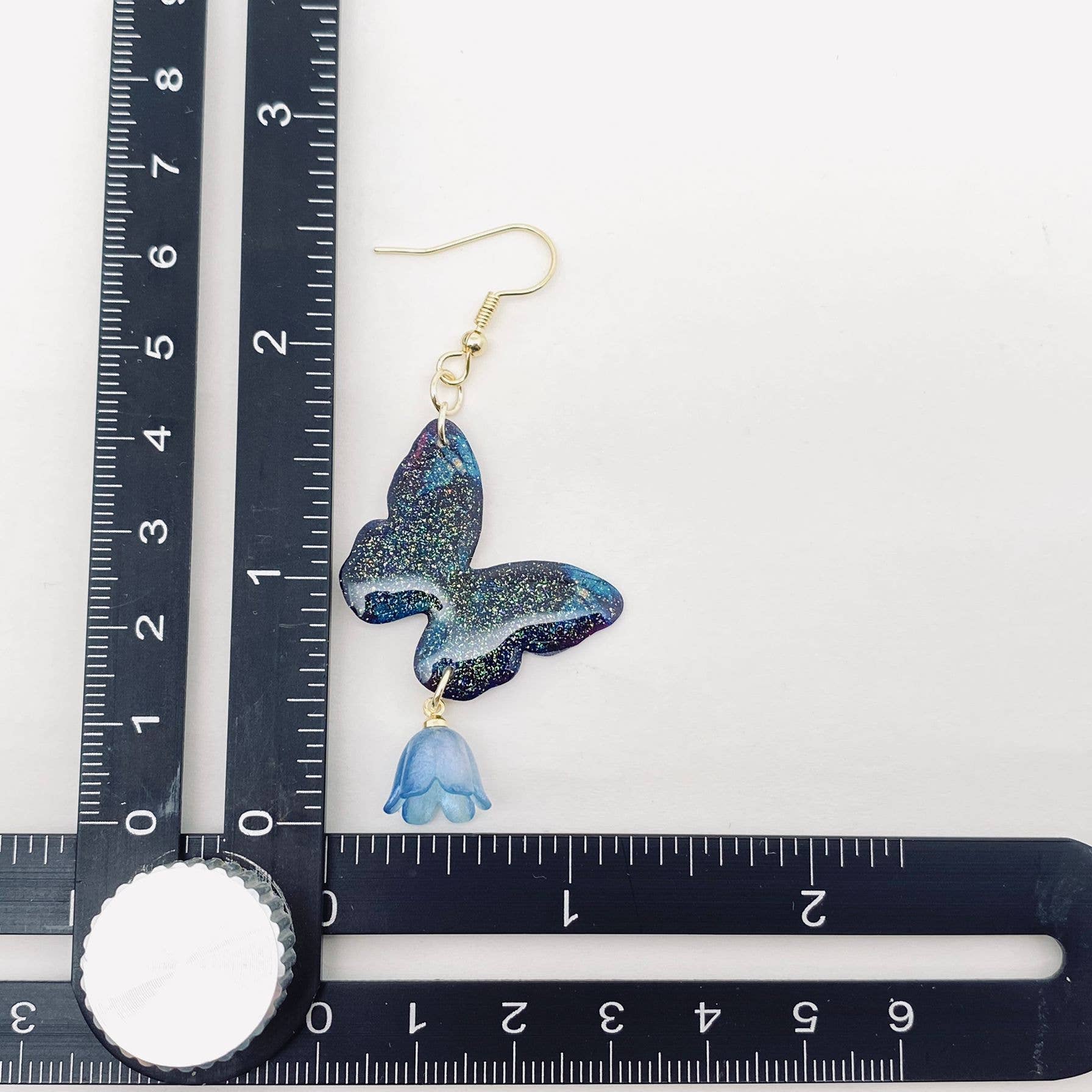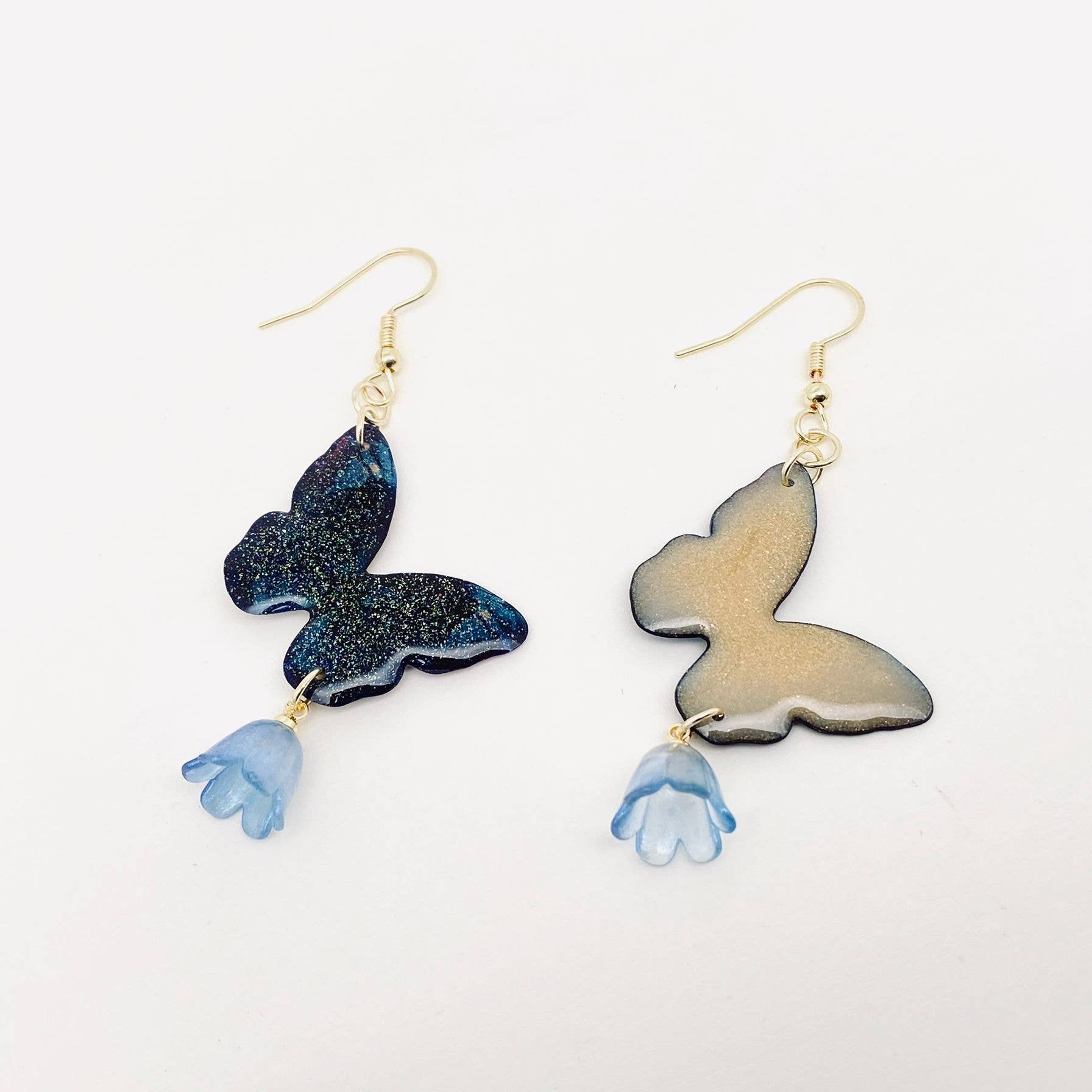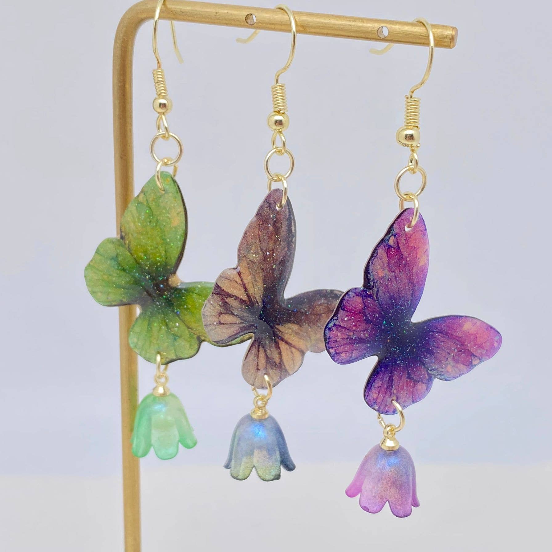 These earrings feature a charming design inspired by the act of picking honey from flowers, adorned with delicate butterfly motifs.